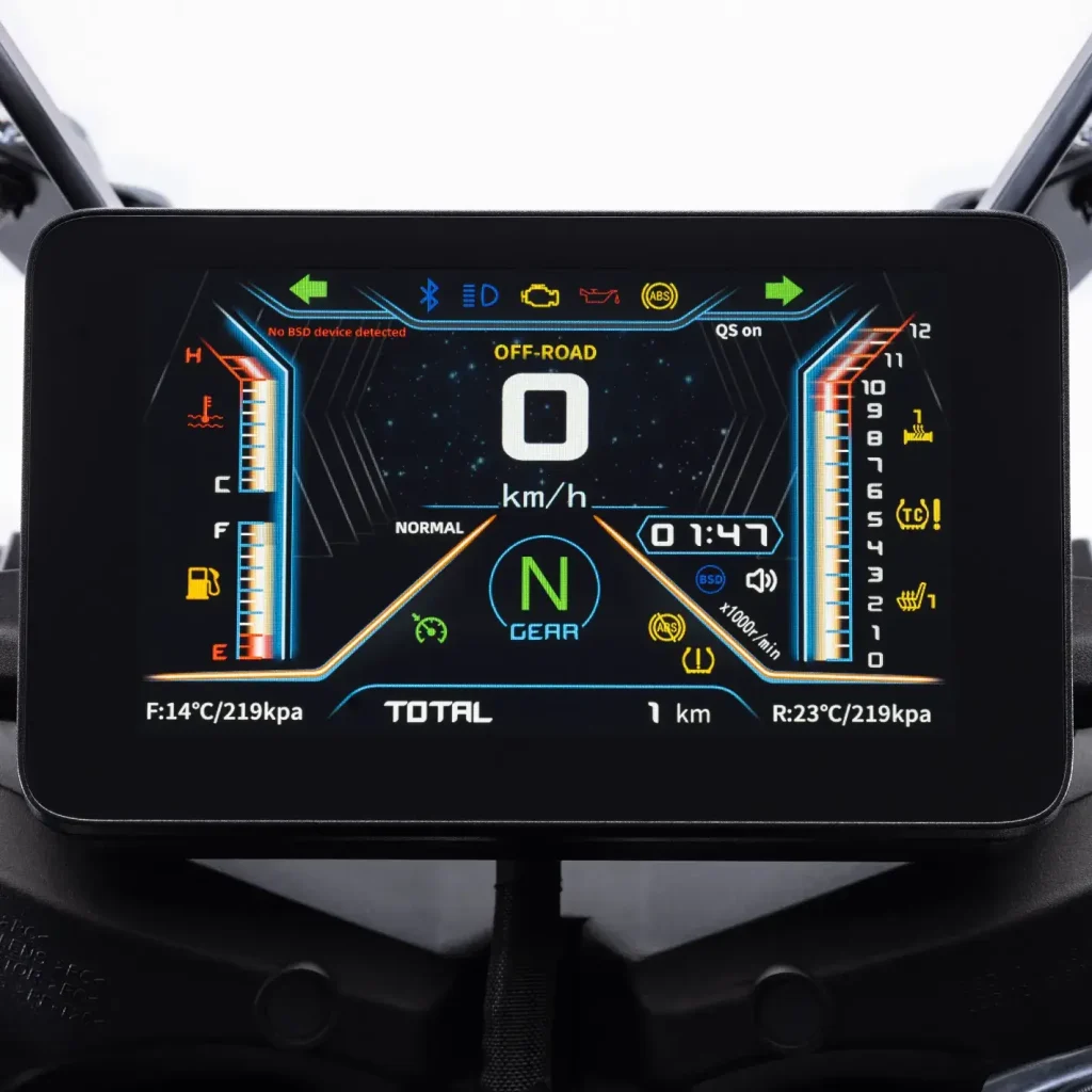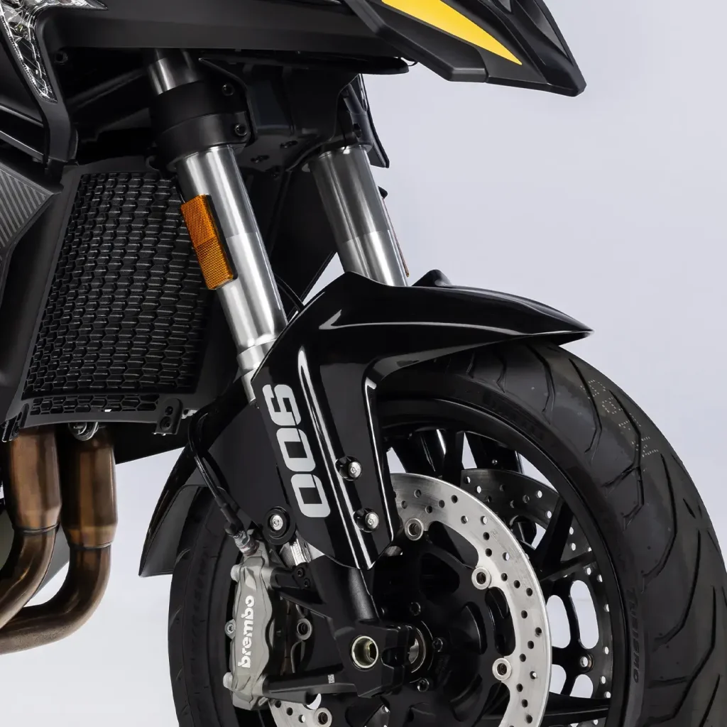 Doble disco delantero mordido por pinzas radiales monobloque Brembo de 4 pistones y acompañado de una bomba de freno Brembo, lo que garantiza una respuesta potente, progresiva y con excelente modulación. El sistema se complementa con ABS Bosch de doble canal desconectable y un TCS (Traction Control System) desconectable, funciones que, a pesar de estar integradas en una versión orientada a la carretera, pueden desactivarse para aquellos usuarios que buscan una experiencia de conducción más directa y controlada.